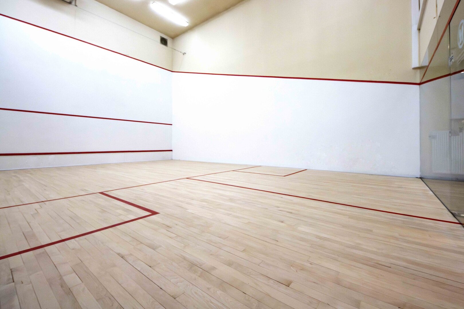Die Länge des Squash-Courts beträgt 9,75 m, die Breite 6,40 m. Die obere Begrenzungslinie der Stirnwand (Frontwand) befindet sich 4,57 m über dem Boden, die Service-Linie (Aufschlaglinie an der Frontwand) 1,83 m (Oberkante).